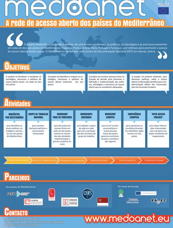Sala aberta a quem estiver interessado a receber informação, material informativo, esclarecimentos práticos sobre o depósito de documentos no RDPC, bem como a transferência de dados para a Plataforma CV DeGóis. Os "open days" realizar-se-ão numa sala com acesso ao Repositório onde se poderão tirar dúvidas e fazer testes de depósito, ficar a conhecer alguns projetos nacionais e internacionais no âmbito do Open Access, da divulgação e utilização de Repositórios, a importância da inventariação e divulgação do conhecimento para o avanço da ciência e a facilidade na busca de documentos científicos. Workshop Nacional MedOANet "O projeto MedOANet(Rede de Acesso Aberto dos Países do Mediterrâneo) pretende trabalhar, de uma forma coordenada, as políticas, as estratégias em cada um dos países do Mediterrâneo: Espanha, França, Grécia, Itália, Portugal e Turquia e, unir esforços para promover o avanço do acesso aberto nesses países. O MedOANet é coordenado pelo Centro de Documentação Nacional (EKT) em Atenas, Grécia." Na passada 2ª feira, dia 22 de Outubro, realizou-se na Universidade do Minho o Workshop Nacional MedOANet, que contou com a presença do Prof. Fernando Capela e Silva em representação da Universidade de Évora. Consulte aqui um texto de opinião acerca da Open Access elaborado pelo Prof. Fernando Capela e Silva, assim como informação adicional acerca do Projeto MedOANet discutido na Universidade do Minho. A Universidade de Évora associa-se à Semana Open Access através da realização de diversas actividades de divulgação do paradigma e do seu Repositório Digital de Publicações Científicas (RDPC). Consulte o plano de actividades aqui. Acompanhe também alguns testemunhos de investigadores/docentes da Universidade de Évora sobre a importância do depósito em acesso livre na divulgação da sua produção científica: - Prof.ª Fátima Baptista - Departamento de Engenharia Rural / Escola de Ciências e Tecnologia / Instituto de Ciências Agrárias e Ambientais Mediterrânicas