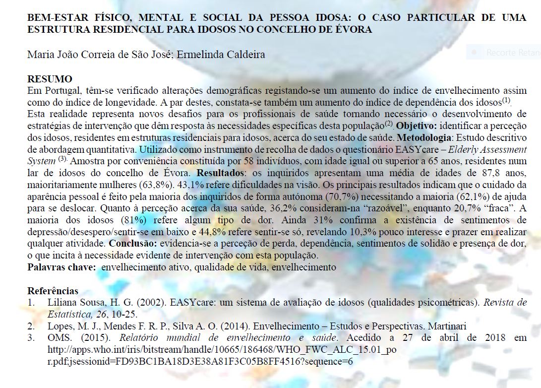 | Citation: | São José, M.; Caldeira, E. (2018). Bem-estar físico, mental e social da pessoa idosa: o caso particular de uma estrutura residencial para idosos no concelho de Évora. V Colóquio Luso-Brasileiro sobre Saúde, Educação e Representações Sociais (CLBSERS) E X Fórum Internacional de Saúde, Envelhecimento e Representações Sociais (FISERS), Évora, 28-30 novembro 2018. Évora: Universidade de Évora. |