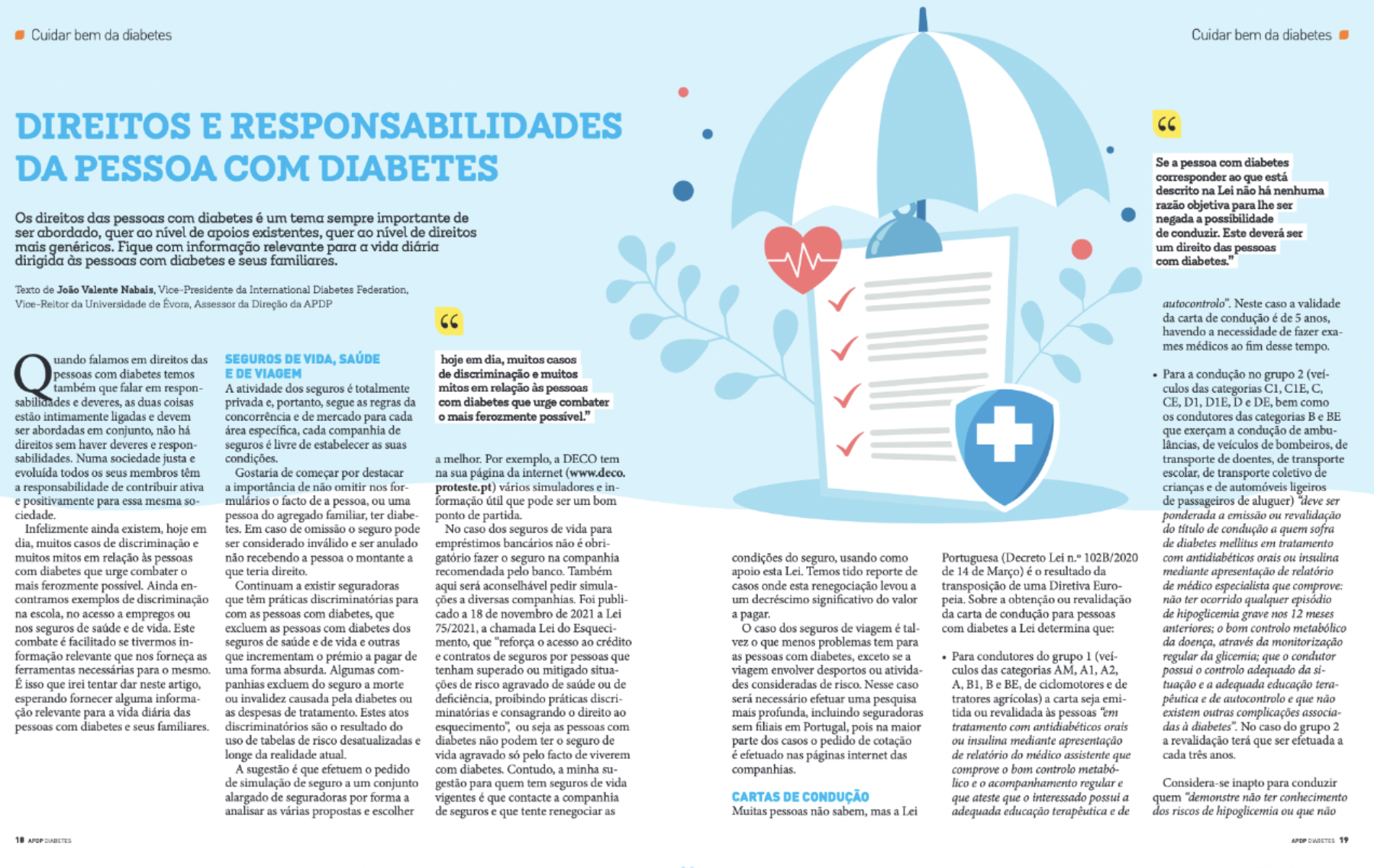 J.M. Valente Nabais. DIREITOS E RESPONSABILIDADES DA PESSOA COM DIABETES. Seguros, carta de condução, emprego e assistência à família. Diabetes-Viver em Equilíbrio (ISSN 0873-45DX) 104 (2022) 18-20