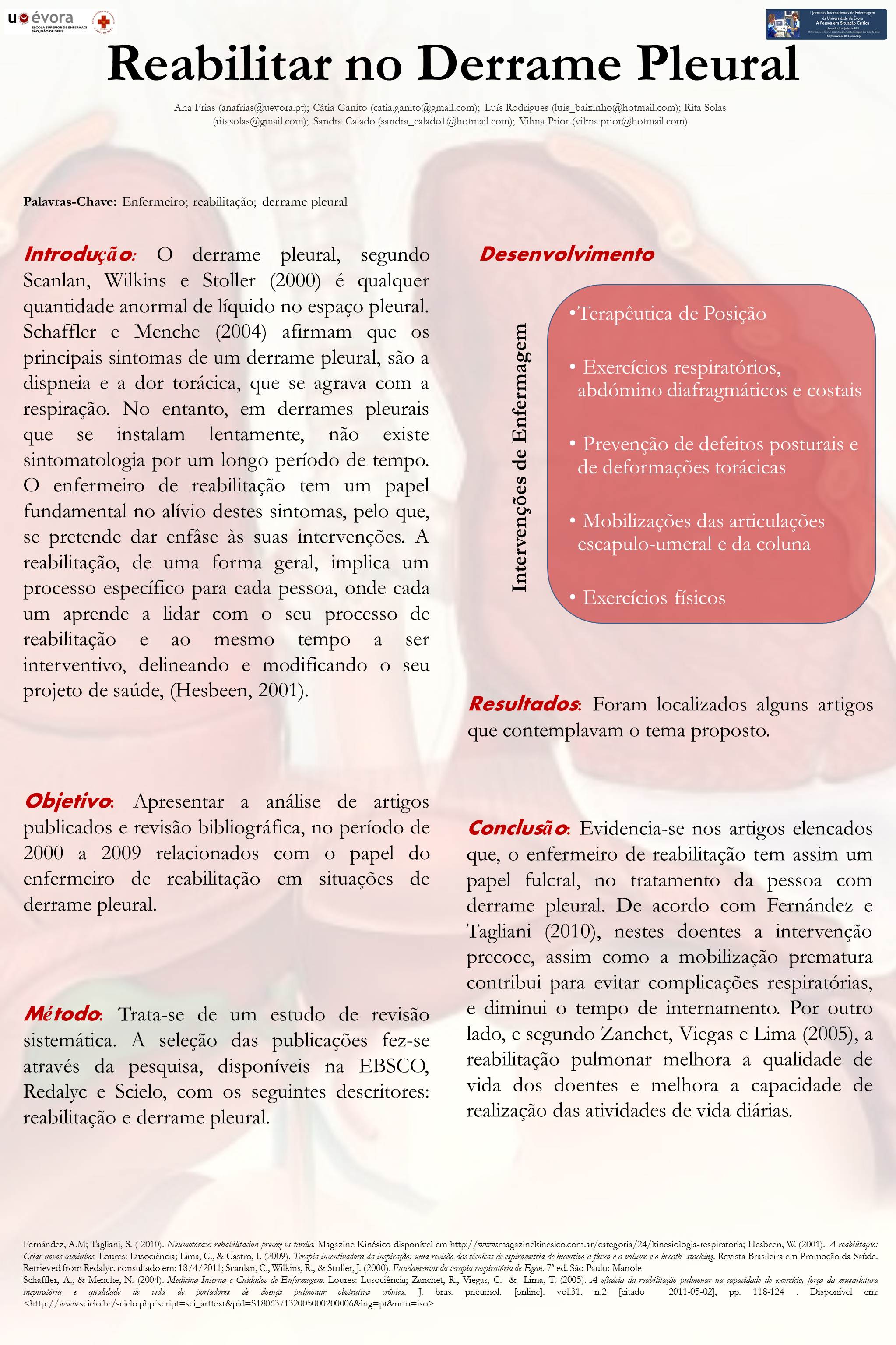 | Citation: | Frias,A.,Ganito,C.,Rodrigues,L.,Solas,R.,Calado,S.,Prior,V.(2011). Reabilitar no Derrame Pleural.I Jornadas Internacionais de Enfermagem da Universidade de Évora. |