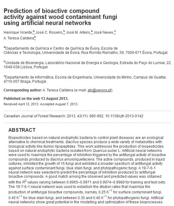 | Citation: | Vicente, H., Roseiro, J.C., Arteiro, J.M., Neves, J. & Caldeira, A.T., Prediction of bioactive compounds activity against wood contaminant fungi using artificial neural networks. Canadian Journal of Forest Research, 43:985-992, 2013 |