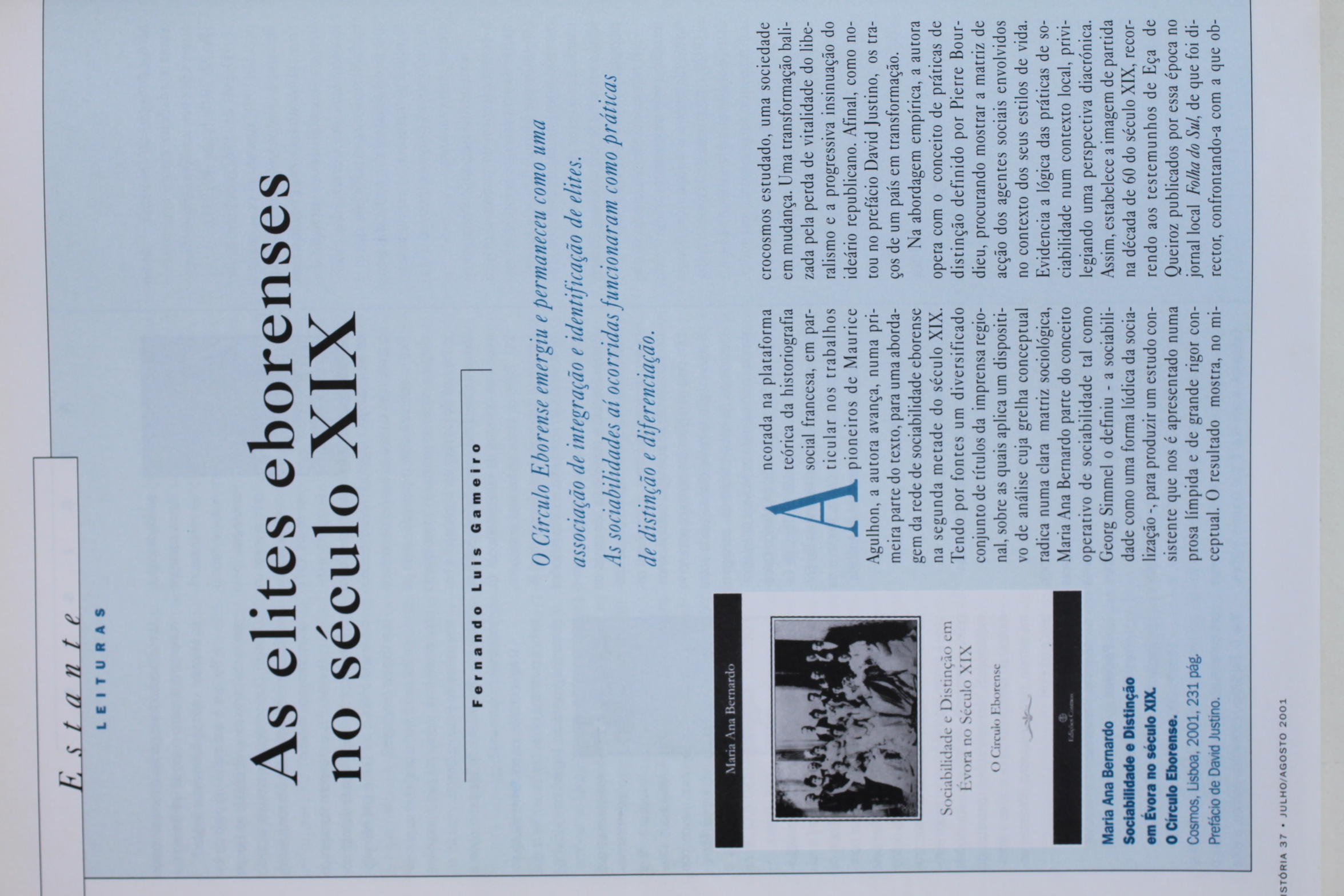 | Citation: | Gameiro, Fernando Luís - Maria Ana Bernardo - Sociabilidade e Distinção em Évora no Século XIX. Lisboa: Cosmos, 2001, 211 p. In História, nº 23 (3ª série), 2001, pp. 64-66. ISSN: 104-921. |