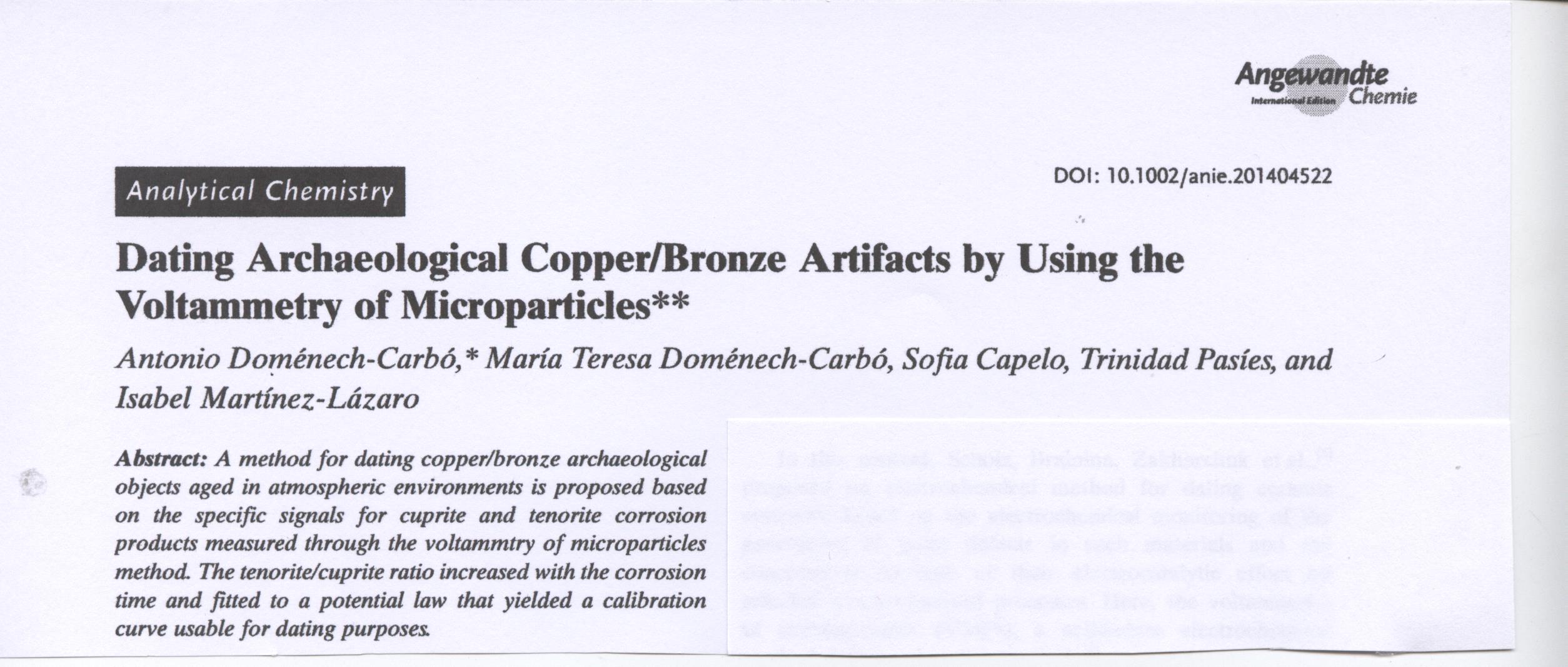 | Citation: | A. Doménech-Carbó, M.T. Doménech-Carbó, Sofia Capelo, T. Pasíes, and I. Martínez-Lázaro, Dating Archaeological Copper/Bronze Artifacts by Using the Voltammetry of Microparticles, Angewandte Chemie International Edition 2014, 53, 1–6. |