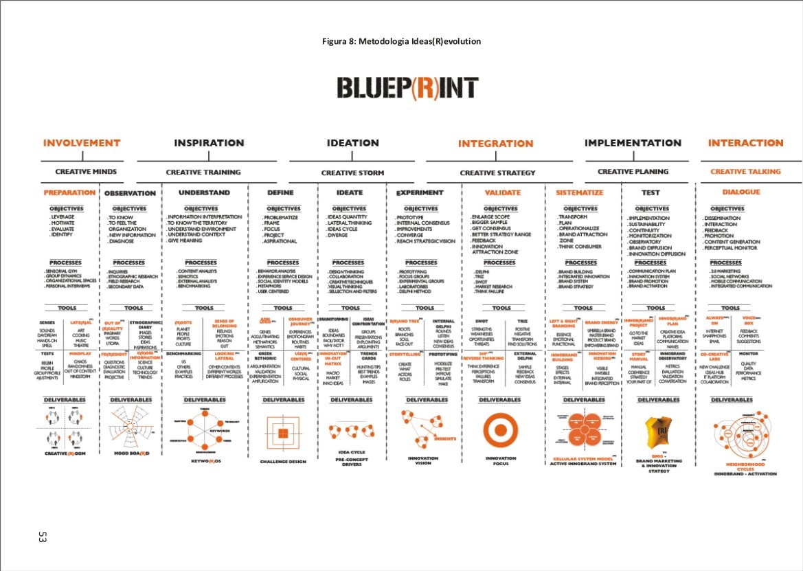It was designed in two phases, a theoretical and a practical. The literature review shows concepts that influenced directly the project and the methodology applied in the InovCity Évora case. The methodology named Ideas (R) evolution is an experimental method characterized by the application of processes and dynamic and creative techniques based on a brand management model related with co-creation and co-participation.