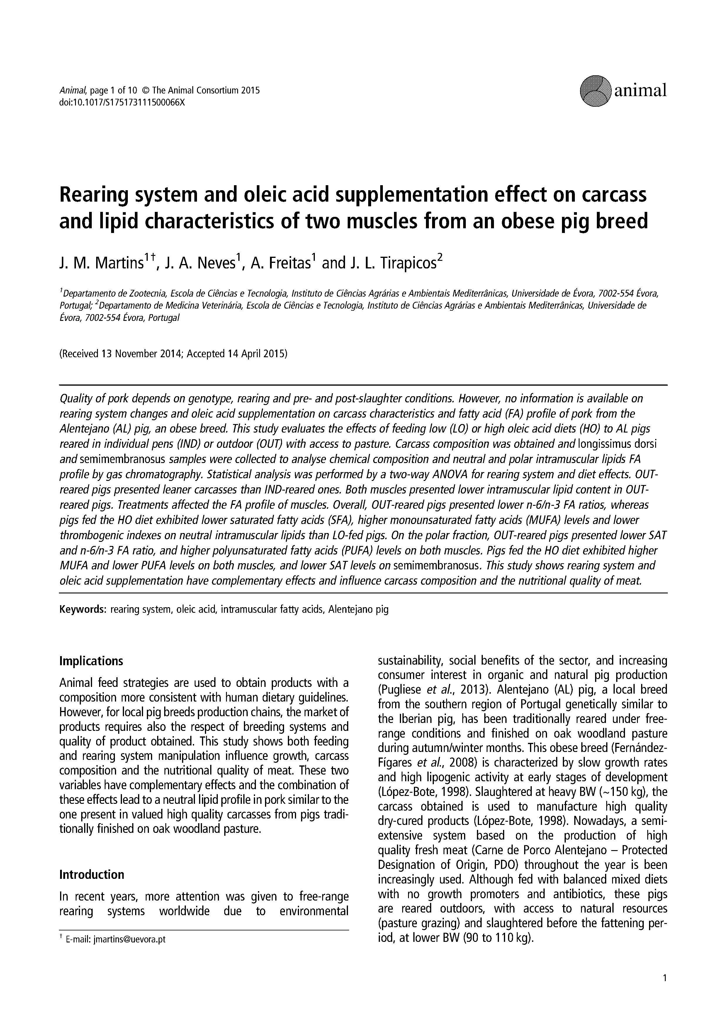 | Citation: | Martins, J. M.; Neves, J. A.; Freitas, A.; Tirapicos, J. L.Rearing system and oleic acid supplementation effect on carcass and lipid characteristics of two muscles from an obese pig breed, animal, 9, 10, 1721-1730, 2015. |