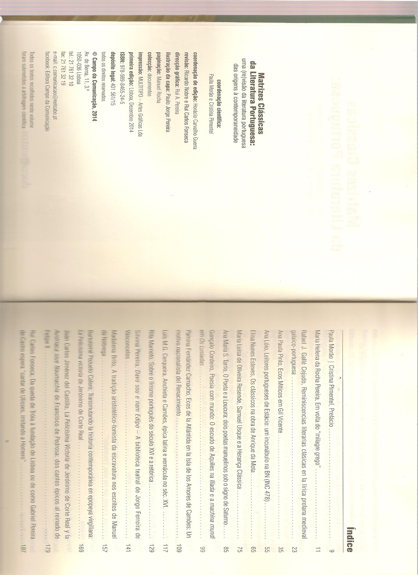 | Citation: | Esteves, Elisa Nunes, 2014,“Os clássicos na obra de Anrique da Mota” in Matrizes Clássicas da Literatura Portuguesa: uma (re)visão da literatura portuguesa das origens à contemporaneidade (coordenação científica de Paula Morão e Cristina Pimentel), Lisboa, Campo da Comunicação, pp. 65-73. |