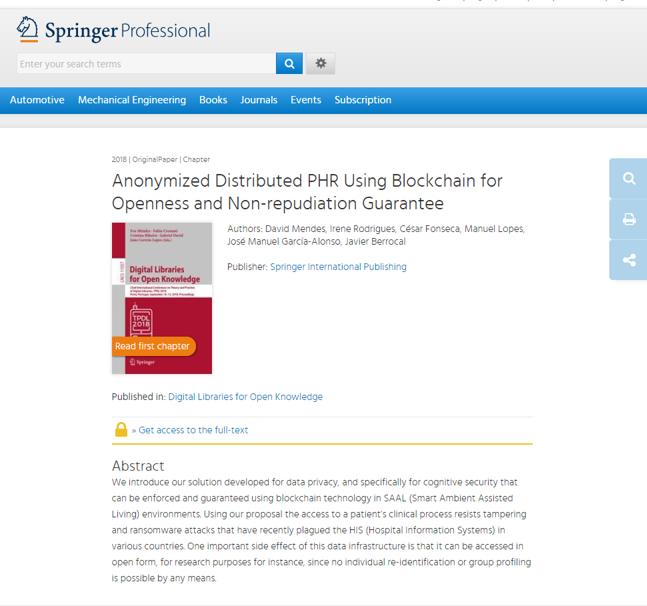 We introduce our solution developed for data privacy, and specifically for cognitive security that can be enforced and guaranteed using blockchain technology in SAAL (Smart Ambient Assisted Living) environments. Using our proposal the access to a patient’s clinical process resists tampering and ransomware attacks that have recently plagued the HIS (Hospital Information Systems) in various countries. One important side effect of this data infrastructure is that it can be accessed in open form, for research purposes for instance, since no individual re-identification or group profiling is possible by any means.