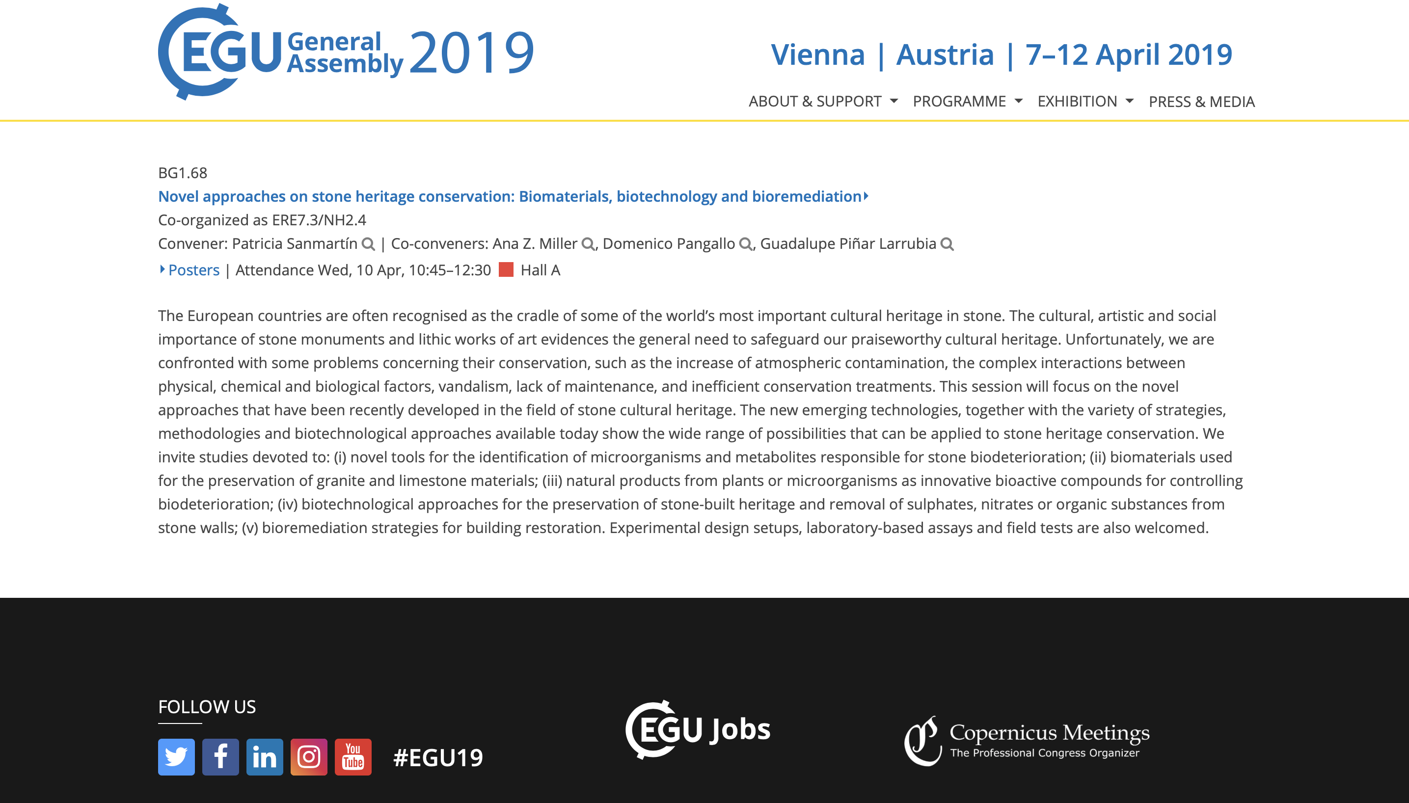 | Citation: | Sanmartín P, Miller AZ, Pangallo D, Piñar G (2019) Session BG1.68 - Novel approaches on stone heritage conservation: Biomaterials, biotechnology and bioremediation. EGU General Assembly 2019 (EGU 2019), 7-12 April 2019, Vienna, Austria. |