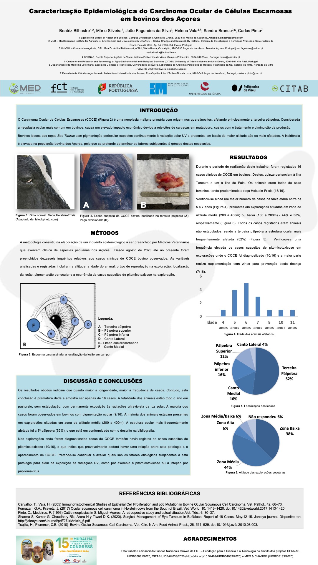 | Citation: | Caracterização Epidemiológica do Carcinoma Ocular de Células Escamosas em Bovinos dos Açores. Beatriz Bilhastre, Mário Silveira, João Fagundes, Helena Vala, Sandra Branco, Carlos Pinto (1 e 2 de março de 2024 – 15ª Jornadas do Hospital Veterinário da Muralha de Évora). |
