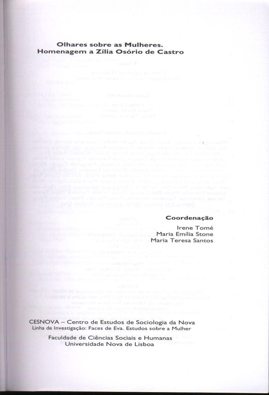 | Citation: | Santos, T., Stone, M.E., Tomé, I. (coords.), Olhares sobre as Mulheres. Homenagem a Zília Osório de Castro, Lisboa: Edição CESNOVA, 2011. |