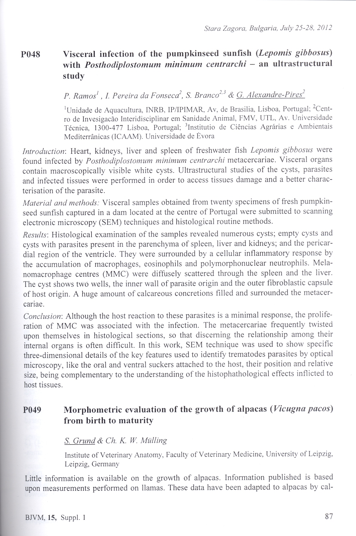 | Title: | VISCERAL INFECTION OF PUMPKINSEED SUNFISH (Lepomis gibbosus) WITH Posthodiplostomum minimum centrarchi – ULTRASTRUCTURAL STUDY |
