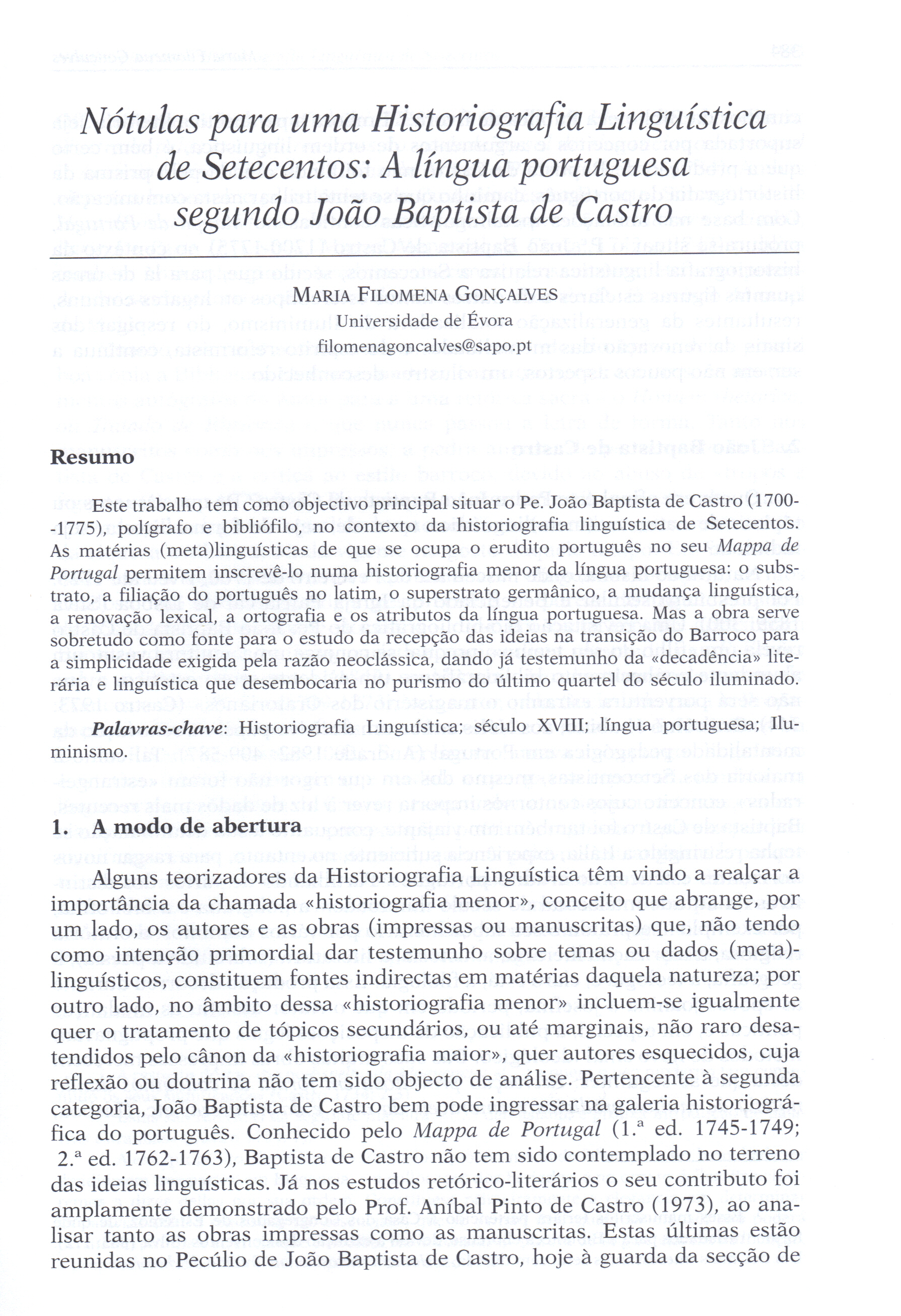 | Title: | Nótulas para uma Historiografia Linguística de Setecentos: a língua portuguesa segundo João Baptista de Castro |