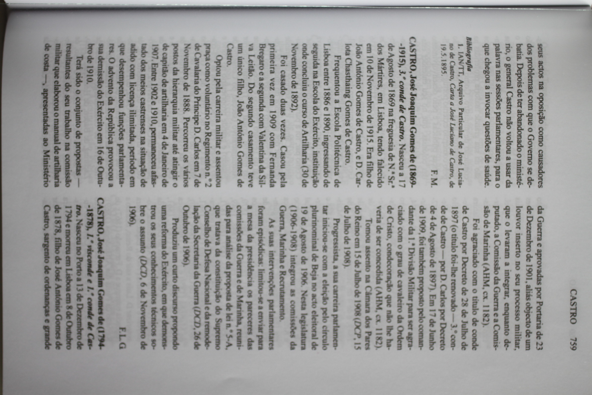 | Citation: | Gameiro, Fernando Luís - Castro, José Joaquim Gomes de. In Maria Filomena Mónica (Coord.), Dicionário Biográfico de Parlamentares (1834-1910), Lisboa: Instituto de Ciências Sociais da Universidade de Lisboa e Assembleia da República, Vol. I., p. 759. ISBN: 972-671-120-7 |