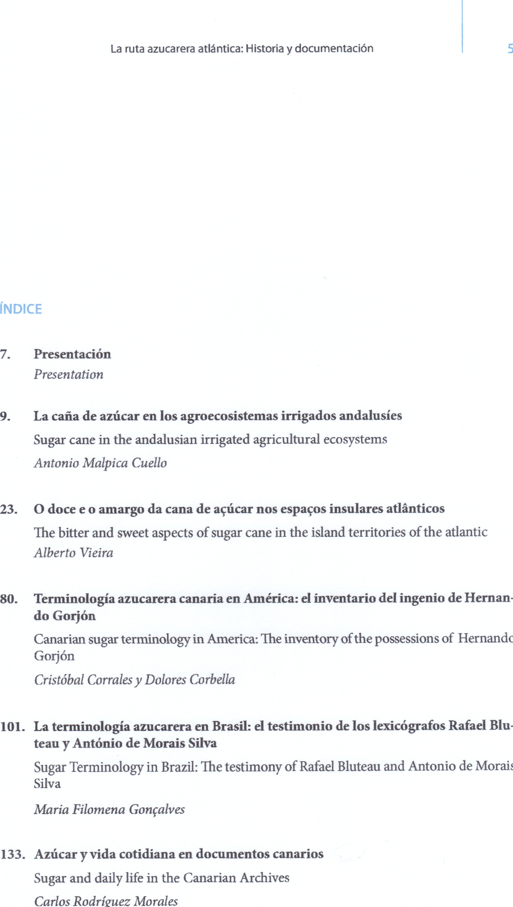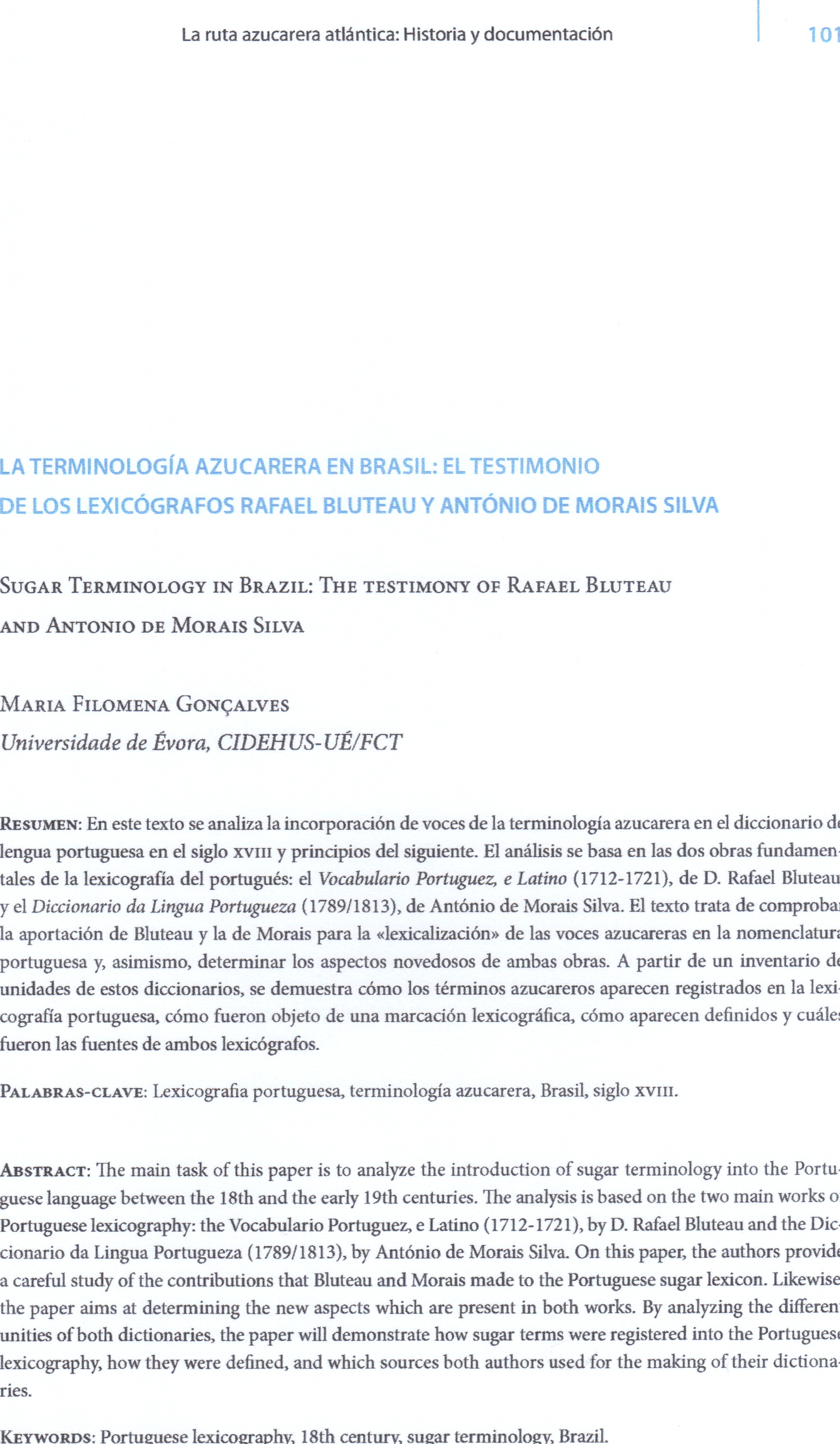 Sugar Terminology in Brazil: The testimony of Rafael Bluteau and Antonio de Morais Silva". In: Ana Viña y Dolores Corbella (eds.),La ruta azucarera atlántica: Historia y documentación. (Colecção Debates, nº5). Região Autónoma da Madeira/Secretaria Regional da Cultura, Turismo e Transportes/ Centro de Estudos de História do Atlântico, pp.101-132. |