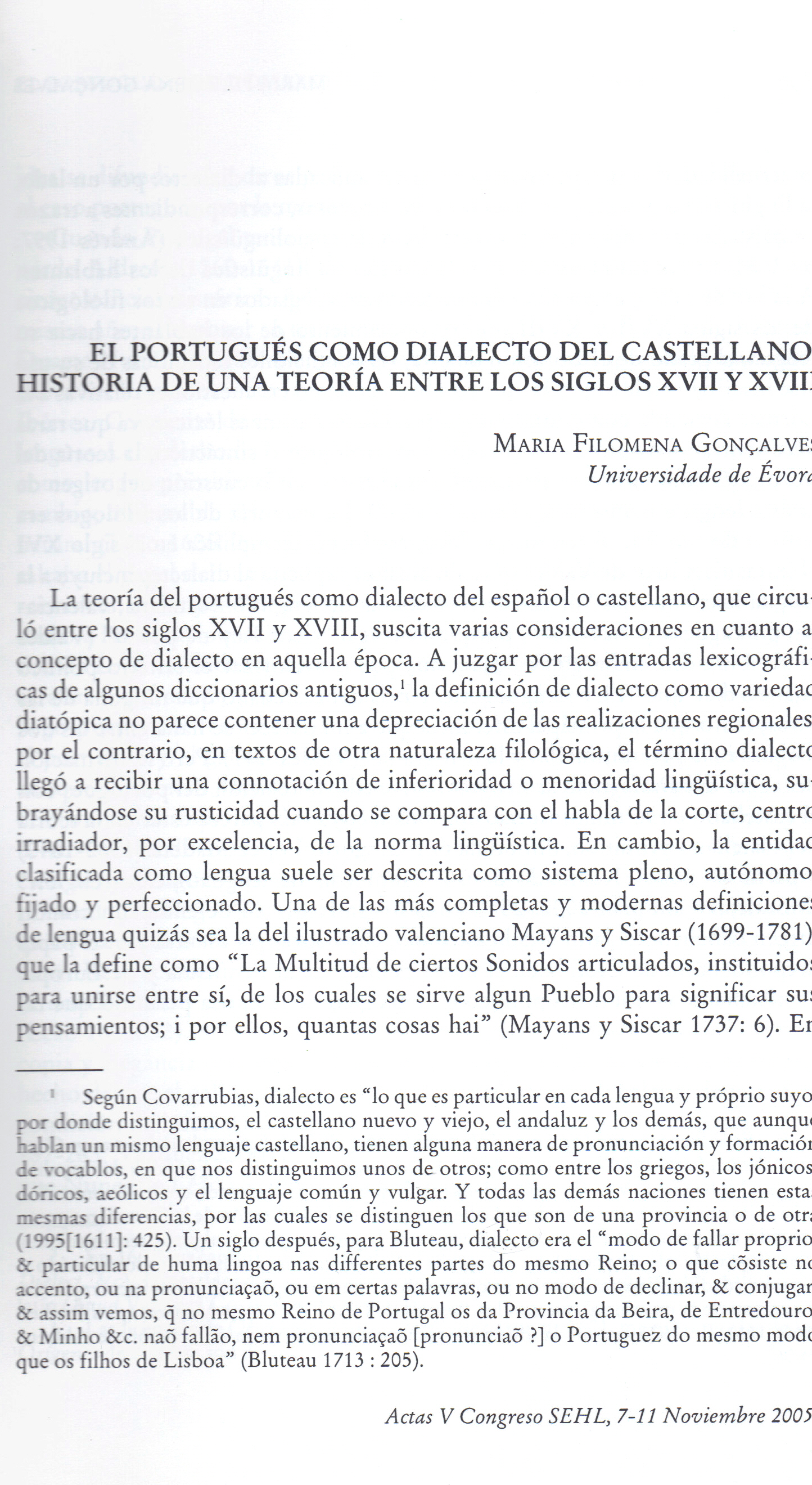 | Citation: | Gonçalves, Maria Filomena (2007), "El portugués como dialecto del castellano: historia de una teoría entre los siglos XVII y XVIII". In: Roldán. A.; Escavy. R, Hérnández, E. Hernández, J. M., López, Mª I. eds., Caminos actuales de la Historiografía Lingüística. Murcia: Universidad de Murcia, pp. 729-741. |
