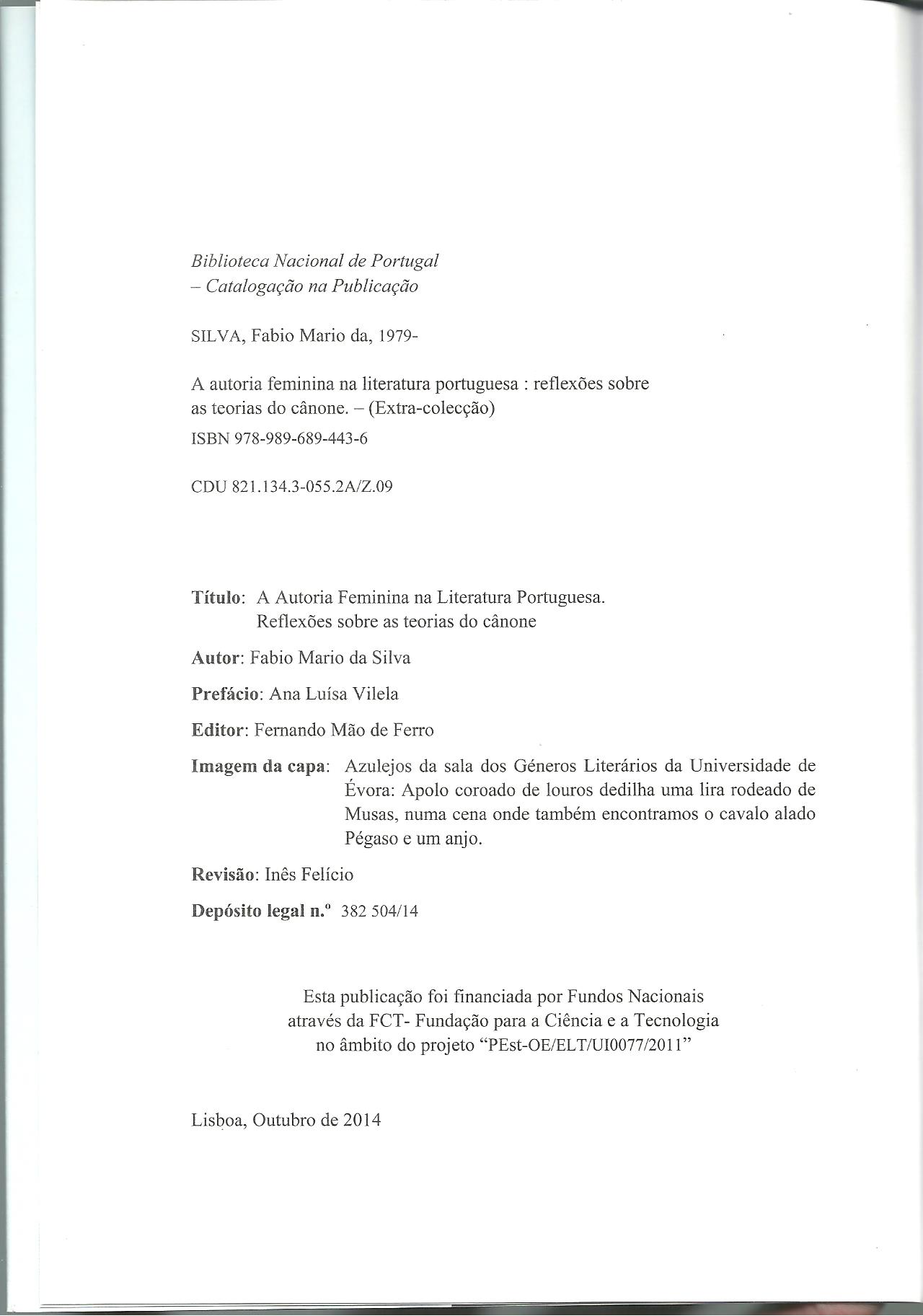 | Citation: | Vilela, "Prefácio". Silva, Fabio Mario, A Autoria Feminina na Literatura Portuguesa. Reflexões sobre as teorias do Cânone, Lisboa: Colibri, 2014, pp. 9-11. |