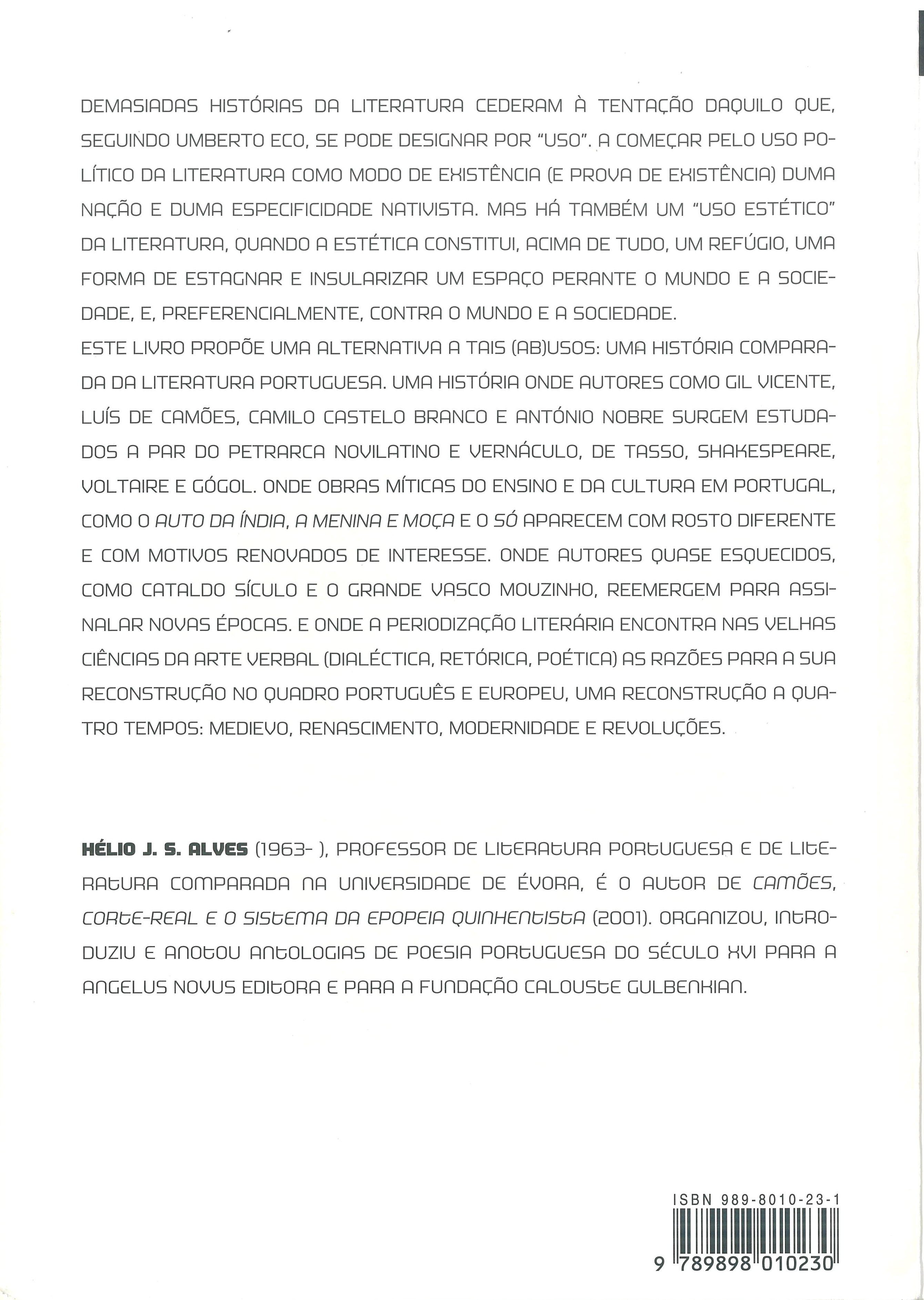 Este livro propõe uma alternativa a tais (ab)usos: uma história comparada da literatura portuguesa, Uma história onde autores como Gil Vicente, Luís de Camões, Camilo Castelo Branco, e António Nobre surgem estudados a par do Petrarca novilatino e vernáculo, de Tasso, Shakespeare, Voltaire e Gógol. Onde obras míticas do ensino e da cultura em Portugal, como o Auto da Índia, a Menina e Moça e o Só, aparecem com rosto diferente e com motivos renovados de interesse. Onde autores quase esquecidos, como Cataldo Sículo e o grande Vasco Mouzinho, reemergem para assinalar novas épocas. E onde a periodização literária encontra nas velhas ciências da arte verbal (Dialéctica, Retórica, Poética) as razões para a sua reconstrução no quadro português e europeu, uma reconstrução a quatro tempos: Medievo, Renascimento, Modernidade e Revoluções. |