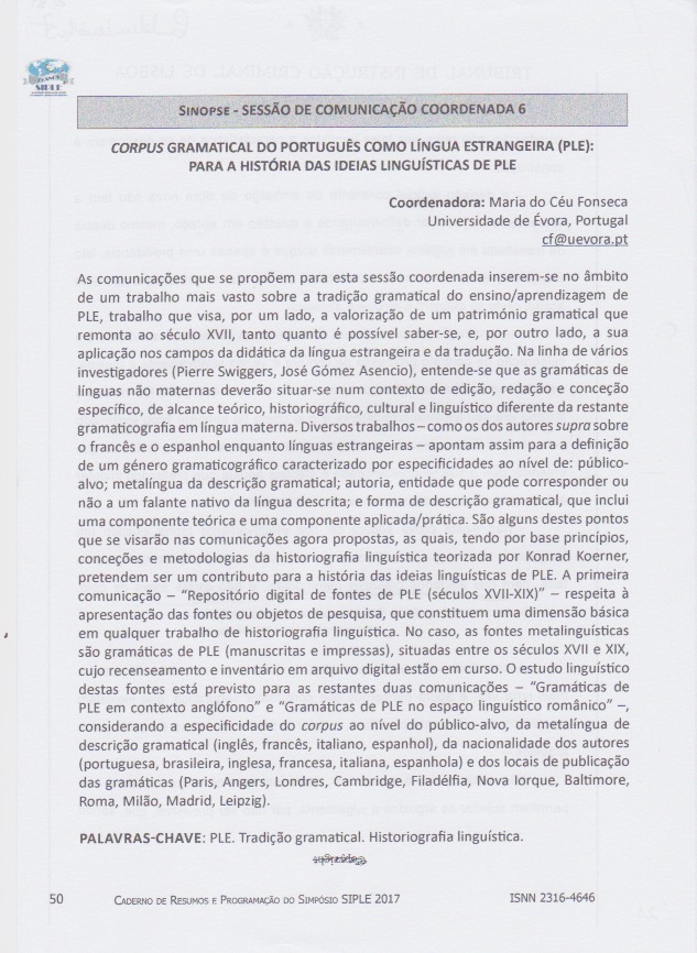 São alguns destes pontos que se visarão nas comunicações agora propostas, as quais, tendo por base princípios, conceções e metodologias da historiografia linguística teorizada por Konrad Koerner, pretendem ser um contributo para a história das ideias linguísticas de PLE. A primeira comunicação – “Repositório digital de fontes de PLE (séculos XVII-XIX)” – respeita à apresentação das fontes ou objetos de pesquisa, que constituem uma dimensão básica em qualquer trabalho de historiografia linguística. No caso, as fontes metalinguísticas são gramáticas de PLE (manuscritas e impressas), situadas entre os séculos XVII e XIX, cujo recenseamento e inventário em arquivo digital estão em curso. O estudo linguístico destas fontes está previsto para as restantes duas comunicações – “Gramáticas de PLE em contexto anglófono” e “Gramáticas de PLE no espaço linguístico românico” –, considerando a especificidade do corpus ao nível do público-alvo, da metalíngua de descrição gramatical (inglês, francês, italiano, espanhol), da nacionalidade dos autores (portuguesa, brasileira, inglesa, francesa, italiana, espanhola) e dos locais de publicação das gramáticas (Paris, Angers, Londres, Cambridge, Filadélfia, Nova Iorque, Baltimore, Roma, Milão, Madrid, Leipzig).