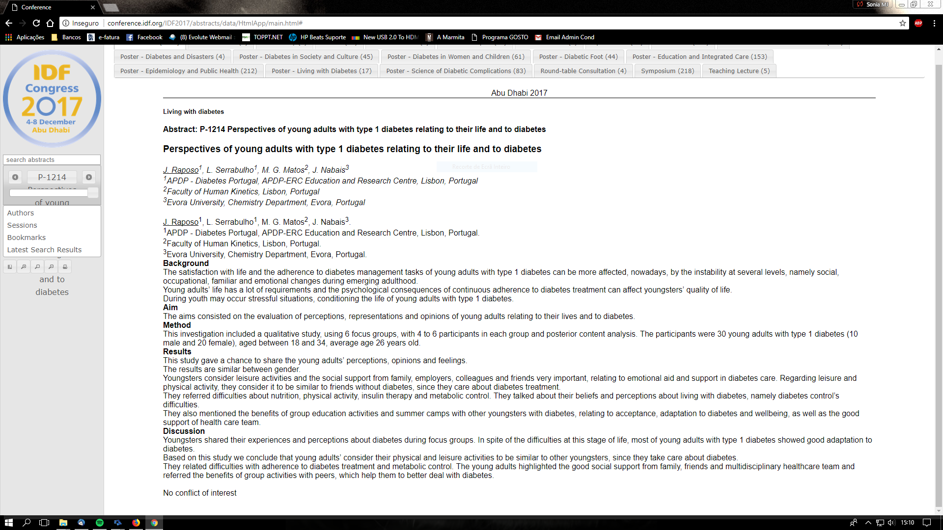 | Citation: | J. Raposo, L. Serrabulho, M.G. Matos, J. Nabais. Perspectives of young adults with type 1 diabetes relating to their life and to diabetes. 2017 Congress of the International Diabetes Federation. Abu-Dabhi (2017) . |