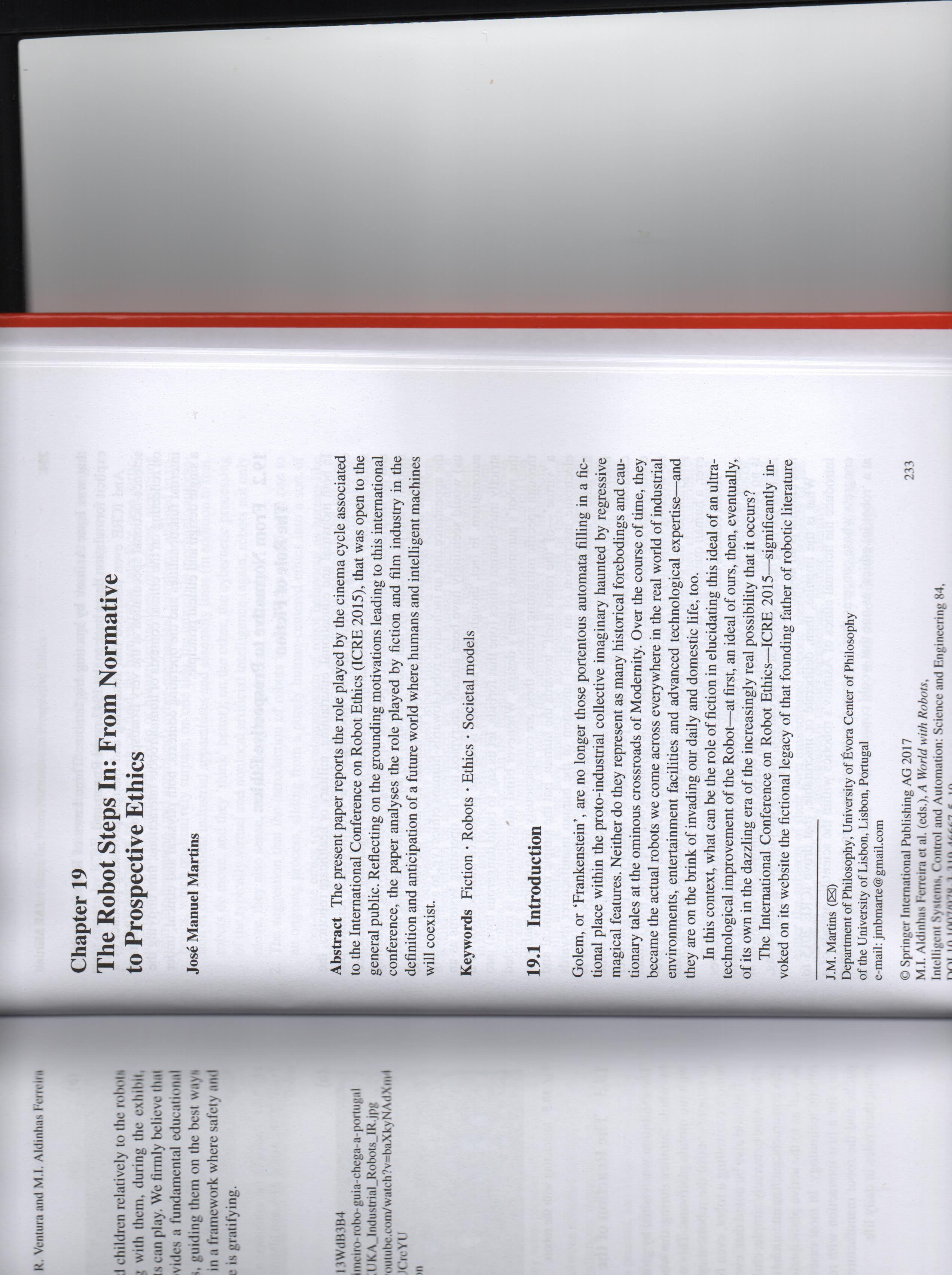 | Citation: | MARTINS, José, “The Robot Steps in: from Normative Ethics (‘ought’) to Prospective Ethics (‘coming to be’) – An Introduction to the Films Westworld – Blade Runner – I, Robot – A.I. Artificial Intelligence”, in A World With Robots, Springer, pp. 233-238 |