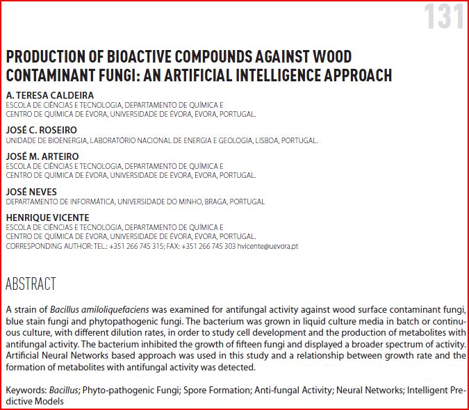 | Citation: | Caldeira, A.T., Roseiro, J.C., Arteiro, J.M., Neves, J. & Vicente, H., Production of Bioactive Compounds Against Wood Contaminant Fungi: An Artificial Intelligence Approach. In Fernando Caldeira Eds., Minimizing the Environmental Impact of the Forest Products Industries, pp. 131-137, University Fernando Pessoa Edition, Porto, Portugal, 2011. |