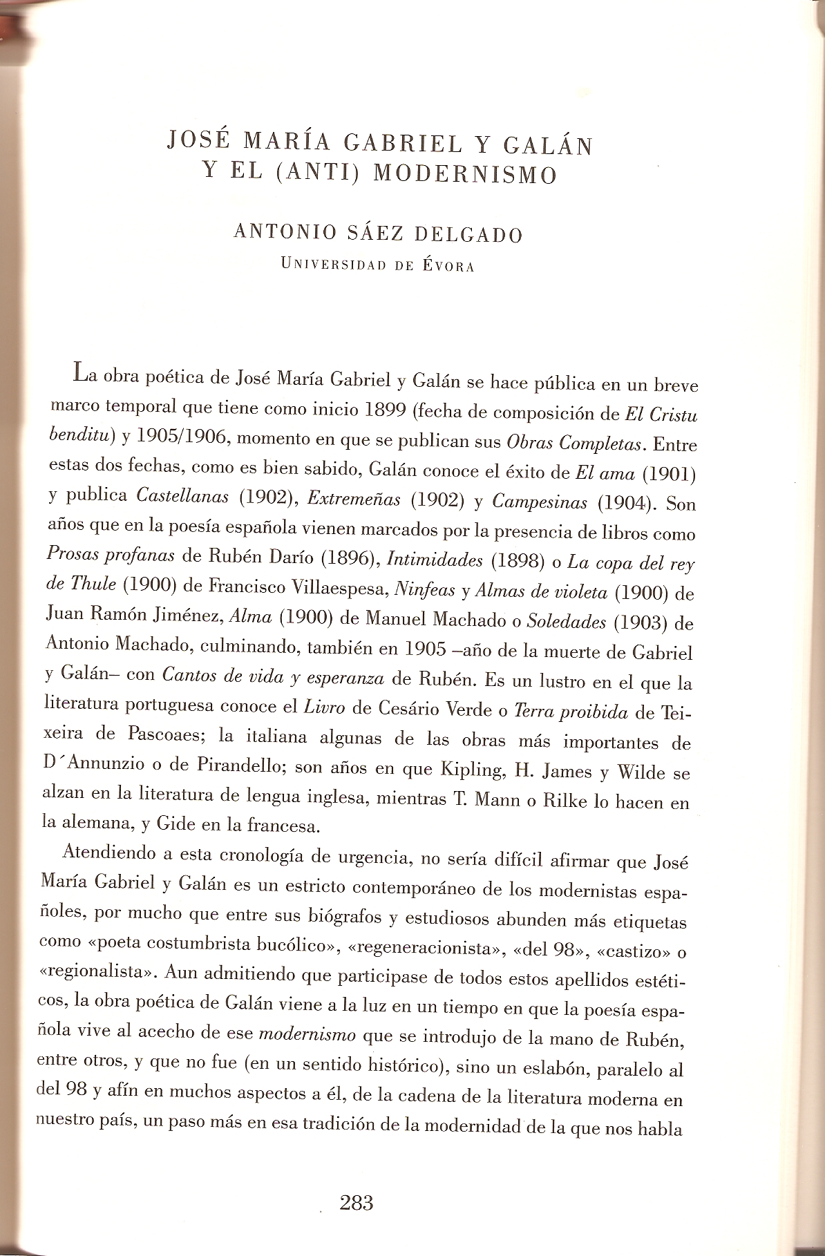 | Citation: | Antonio Sáez Delgado, "José María Gabriel y Galán y el (anti)modernismo", in Antonio Salvador Plans y Álvaro Valverde (eds.), Gabriel y Galán: época y obra, Mérida, ERE, 2006, pp.283-288. |