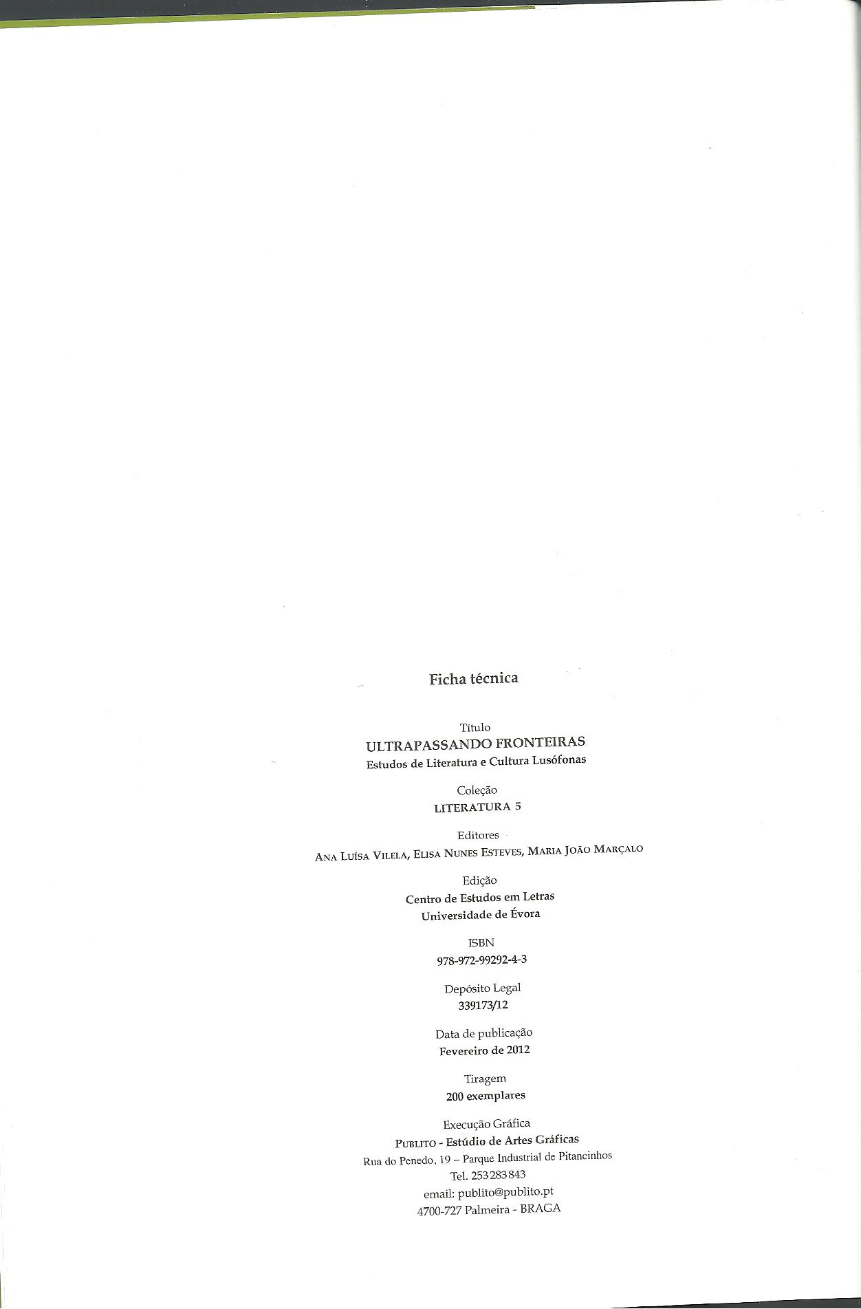 | Citation: | VILELA, Ana Luísa, ESTEVES, Elisa e MARÇALO, Maria João (orgs.), Ultrapassando Fronteiras. Estudos de Literatura e Cultura Lusófonas,col. Literatura 5, Edição Centro de Estudos em Letras, Universidade de Évora. |